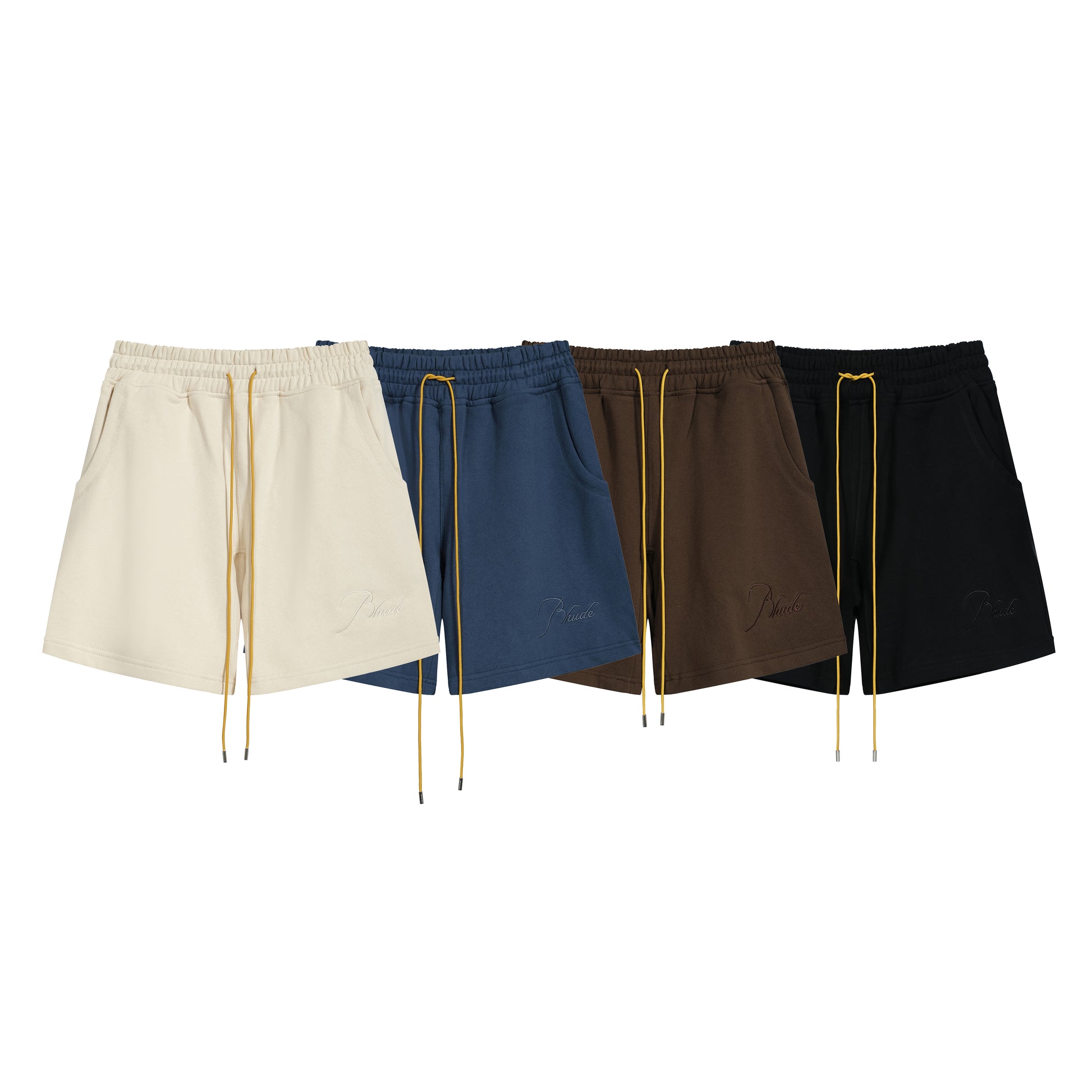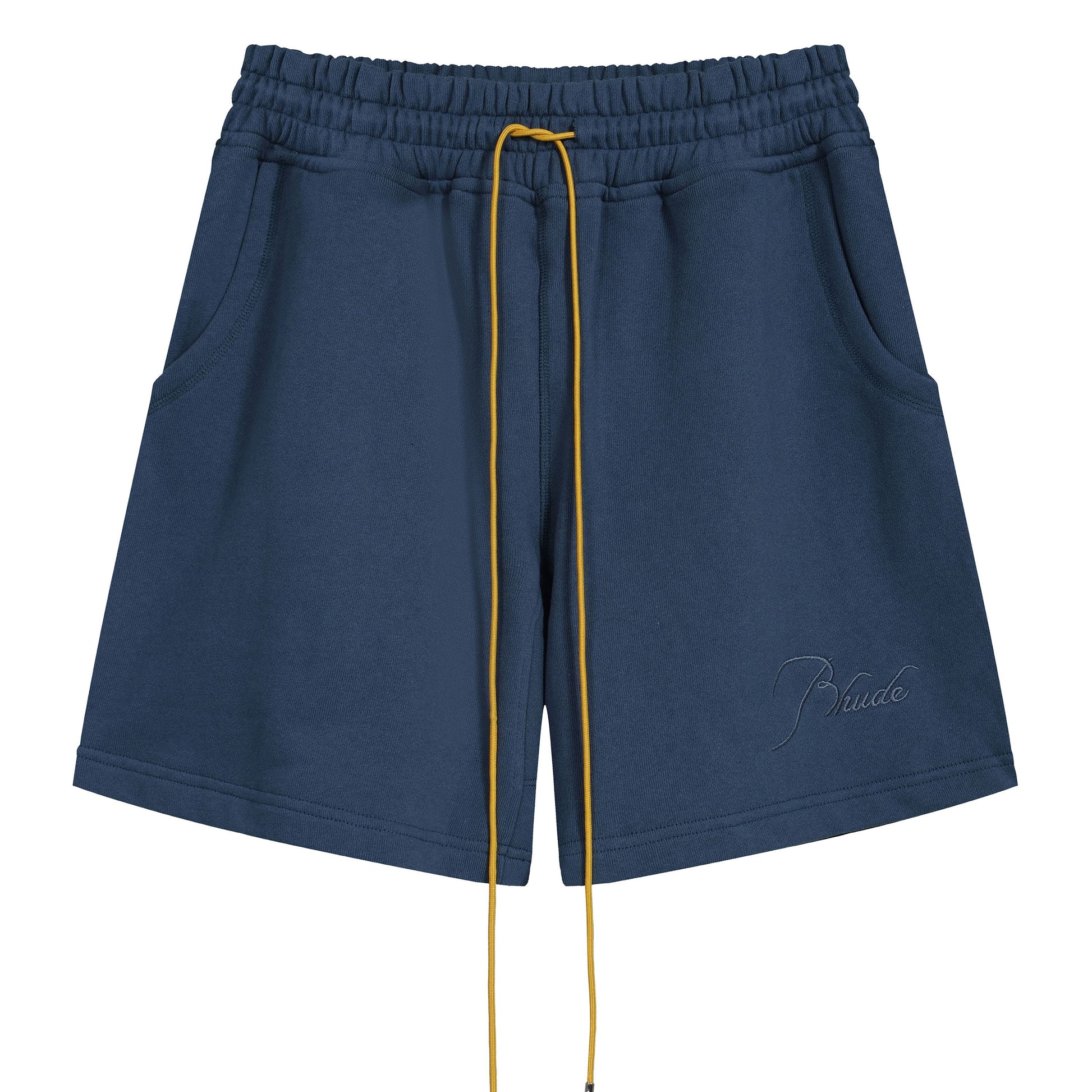 Premium cashmere-supima cotton blend shorts with Rhude logo on front leg. Features two side pockets, one back pocket and extended drawstring in our signature mustard hue. Designed in partnership with The Webster.